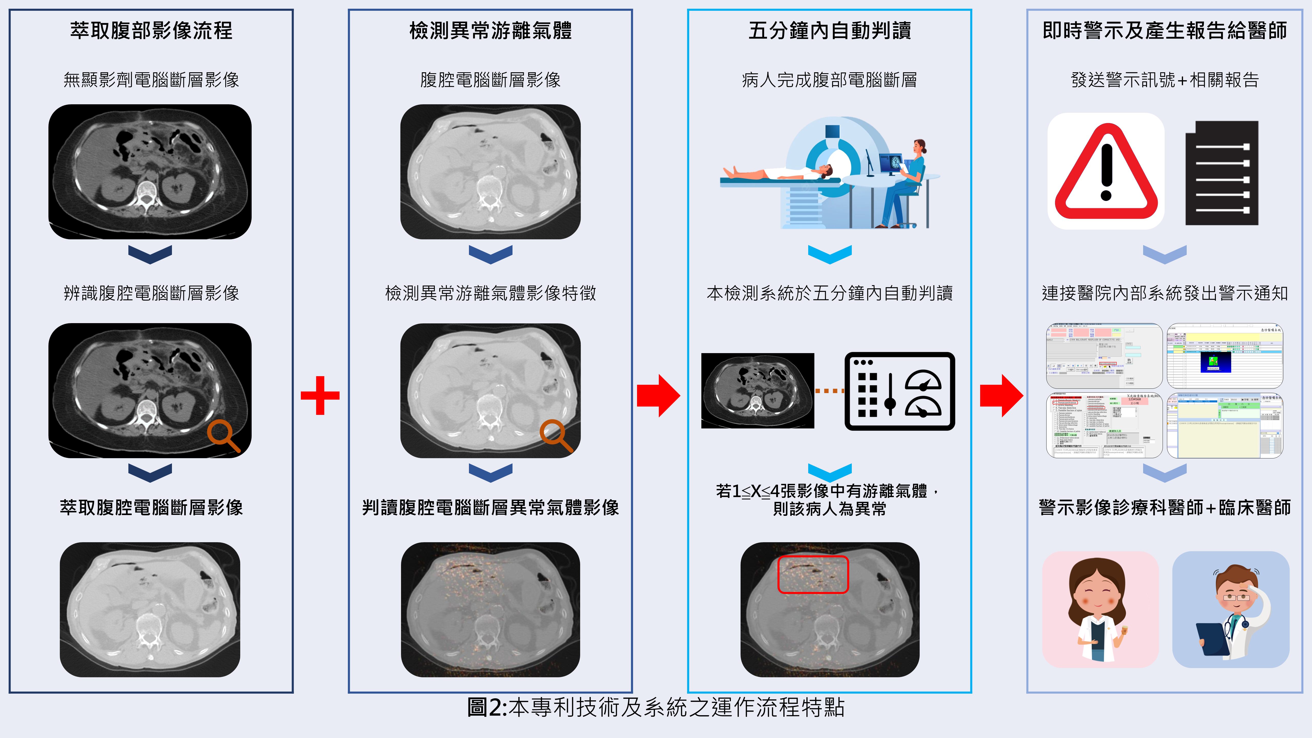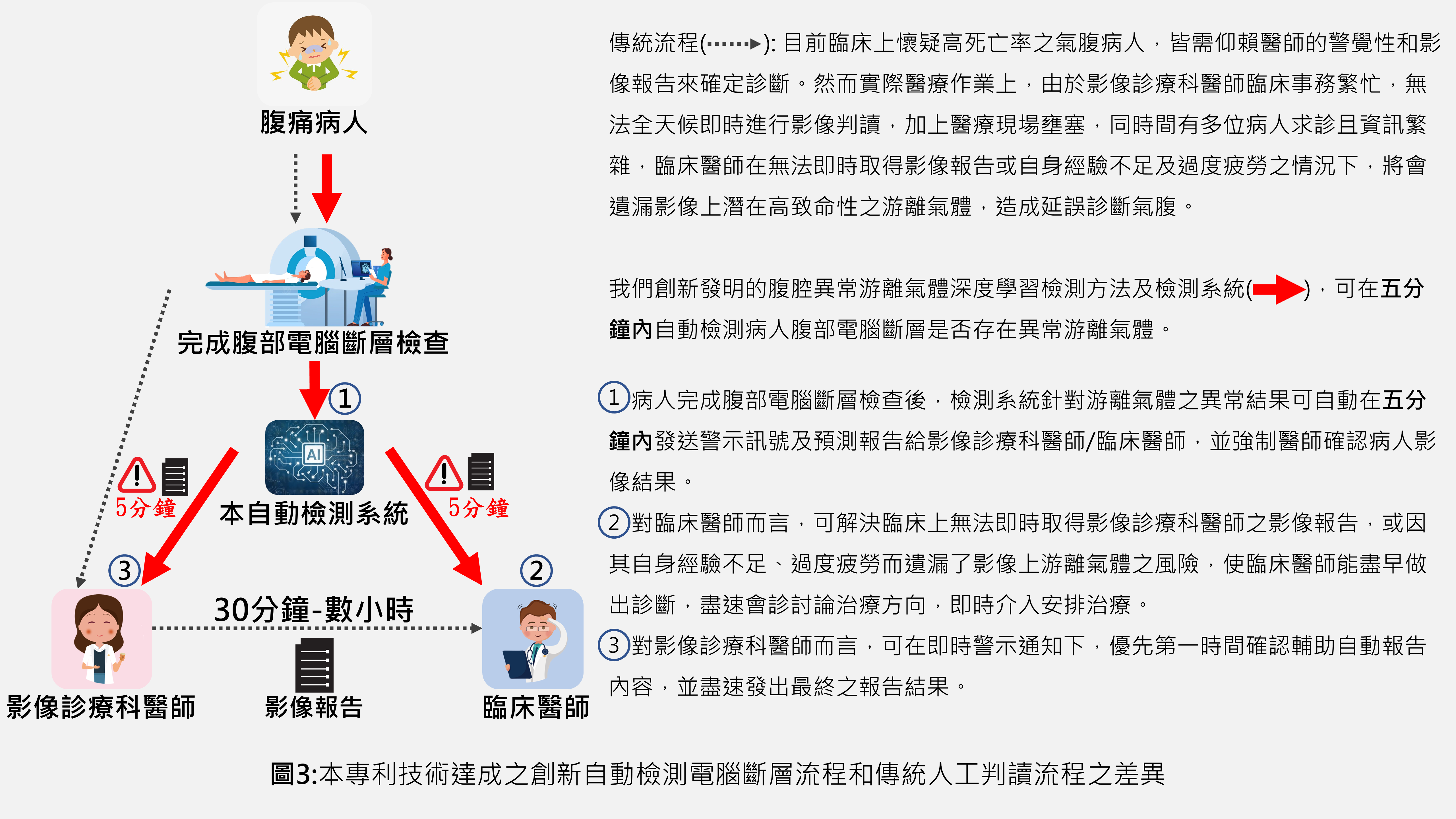 氣腹(Pneumoperitoneum)的定義為腹腔內有游離氣體(Free air)(圖1);腹痛病人若在影像學上產生氣腹,臨床上通常代表器官/腸子破裂,屬於高危險性,需緊急手術以挽救性命,延誤診斷將導致敗血性休克及多重器官衰竭,造成病人死亡。臨床上,電腦斷層已被證實是診斷氣腹最敏感最準確的影像工具。本技術的優勢為5分鐘內可即時自動檢測病人之無顯影劑電腦斷層影像上,腹腔異常游離氣體存在與否,協助醫師們快速診斷氣腹,有效降低病人死亡率(圖2、3)。系統成效相當於臨床經驗豐富的放射診斷科醫師般精準、快速且判讀標準具有一致性,尤其以多張(4張以上)有游離氣體的影像驗證氣腹檢測結果,可取得100%準確度(臨床上氣腹病人最可能之情形)。本技術之潛在全球市場年收益可達5.2兆新台幣。
