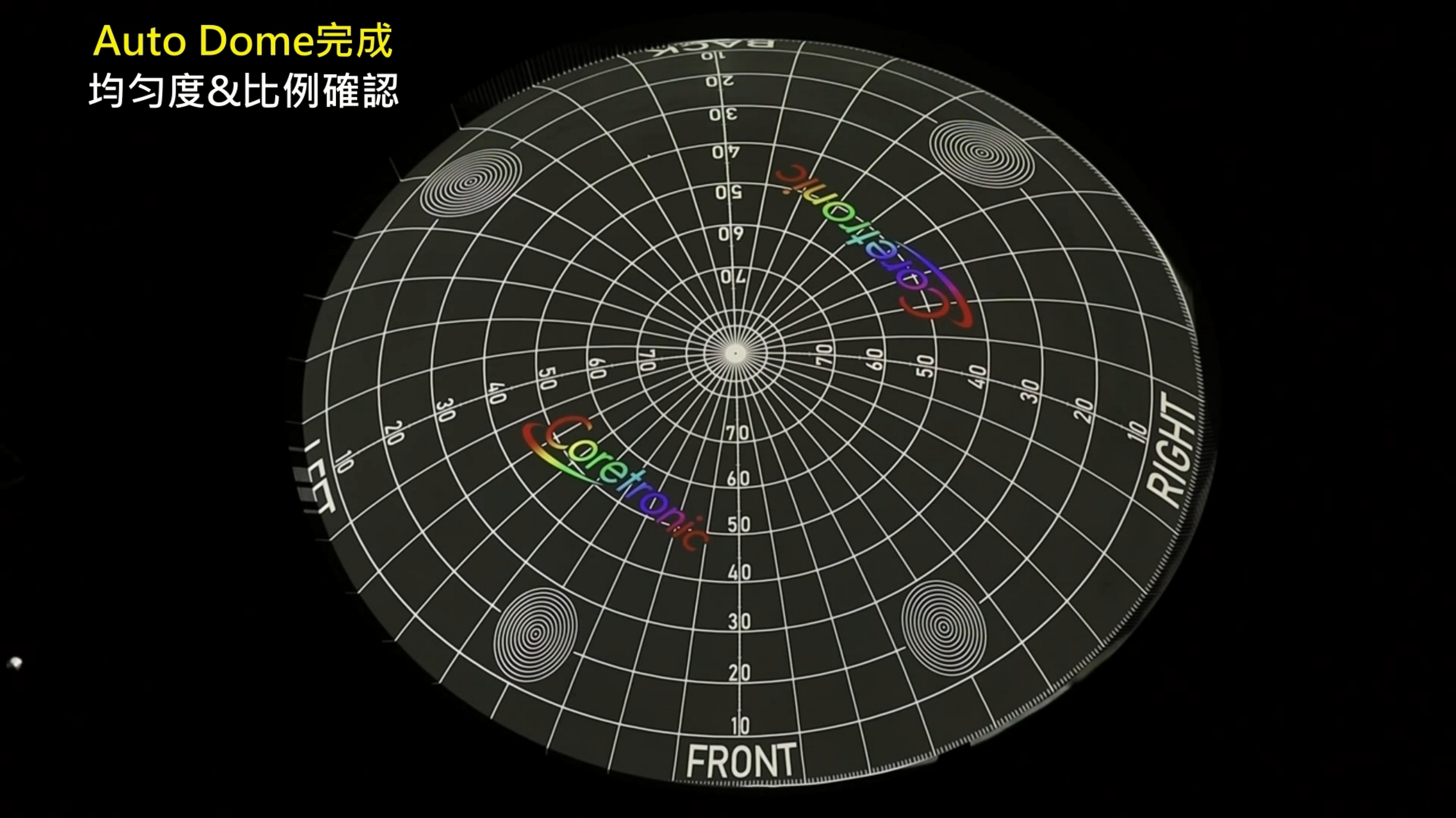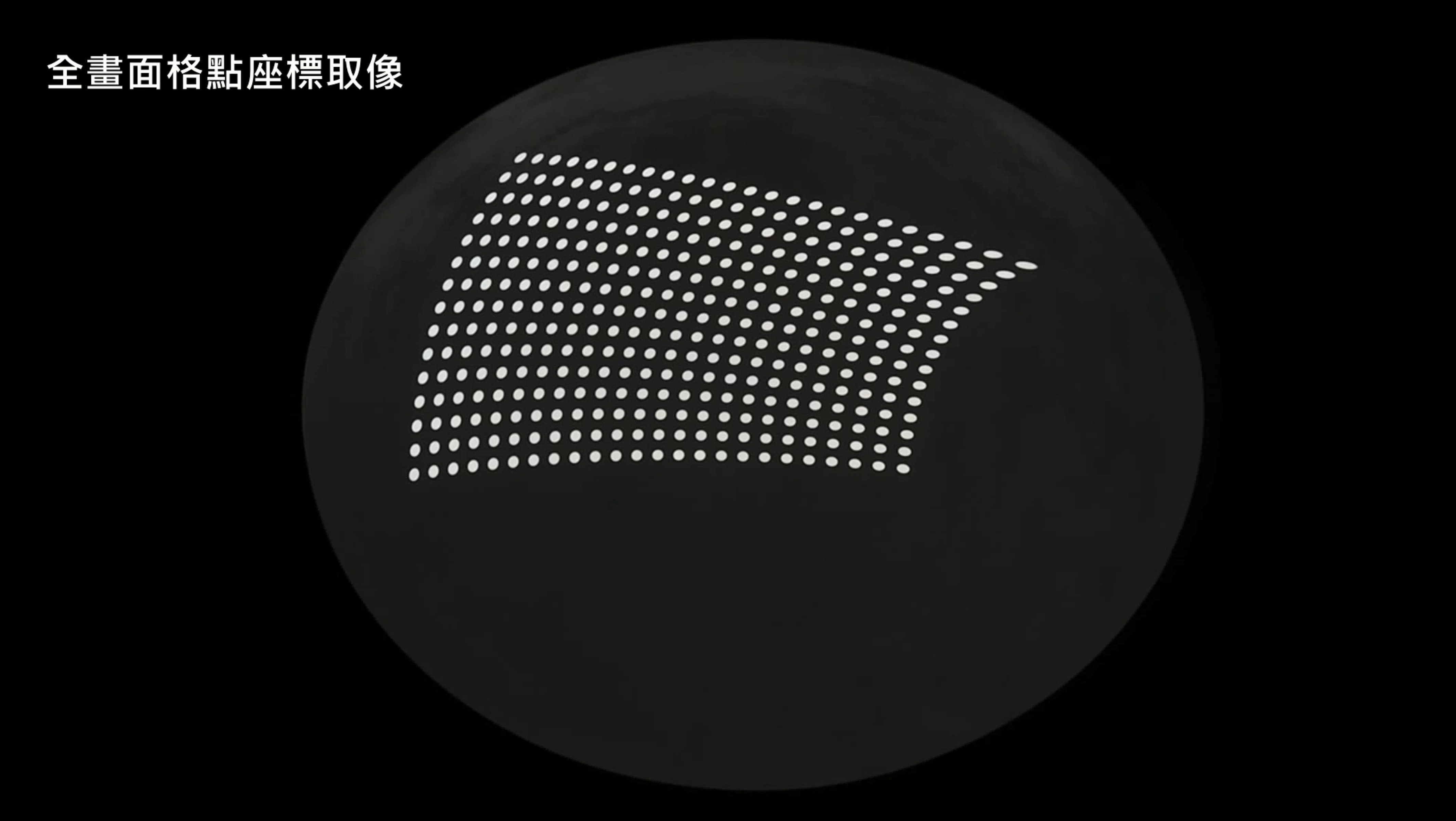 本發明採用非等距三圓格點定位方式,解決多投影機自動拼接時因環境反射或多角度投影導致的格點辨識問題。此設計能有效排除干擾,準確計算投影畫面座標及區域,並辨識投影方向。適用於平面拼接(大型螢幕、展覽)、穹頂拼接(球幕劇院、模擬艙)及沉浸式投影(VR劇場),大幅提升拼接精度與效率。其非對稱格點技術結合自動黑階調整,為全球獨創,減少人工成本與時間,在自動化拼接市場具高度競爭優勢與商業價值。