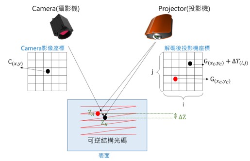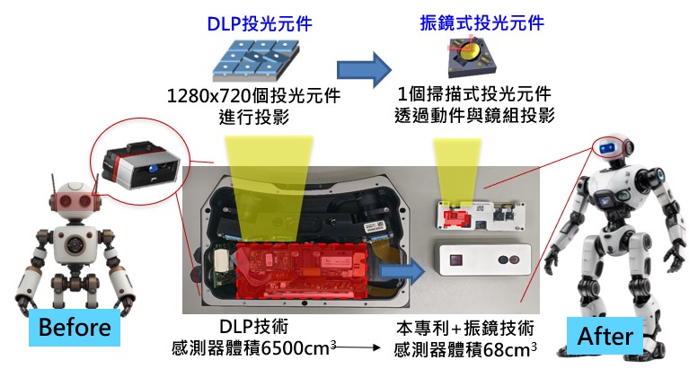 本專利創新校正技術,以振鏡式掃描投光模組創造新一代3D感測器。傳統工業級3D感測器採用DLP技術,體積過大且速度過慢,而振鏡式掃描技術則精度太差,無法用於工業。本專利幫忙解決振鏡掃描技術動件誤差,造成投射解碼光斑易變形問題,創造『精準』、『小體積』 、『速度快』的新一代3D視覺感測器。