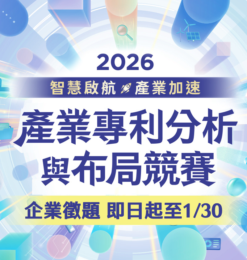 「2026年產業專利分析及布局競賽」徵求企業出題,攜手產業共創雙贏。(智慧財產局)一、為促進創新及研發成果之流通與運用,本局持續辦理「產業專利分析與布局競賽」,建構國內外產官學研交流專利分析與布局知識及掌握產業趨勢之重要平台。自競賽開辦以來成效良好,2026年將邁入第6年,並續採「企業出題、人才解題」模式,將產業第一線實務需求與關注重點融入競賽題目。期藉由專利分析人才之專業解析,強化產學研交流與合作,協助企業掌握專利技術發展趨勢及布局方向,同時培育智慧財產專業人才,營造有利產業... - 6