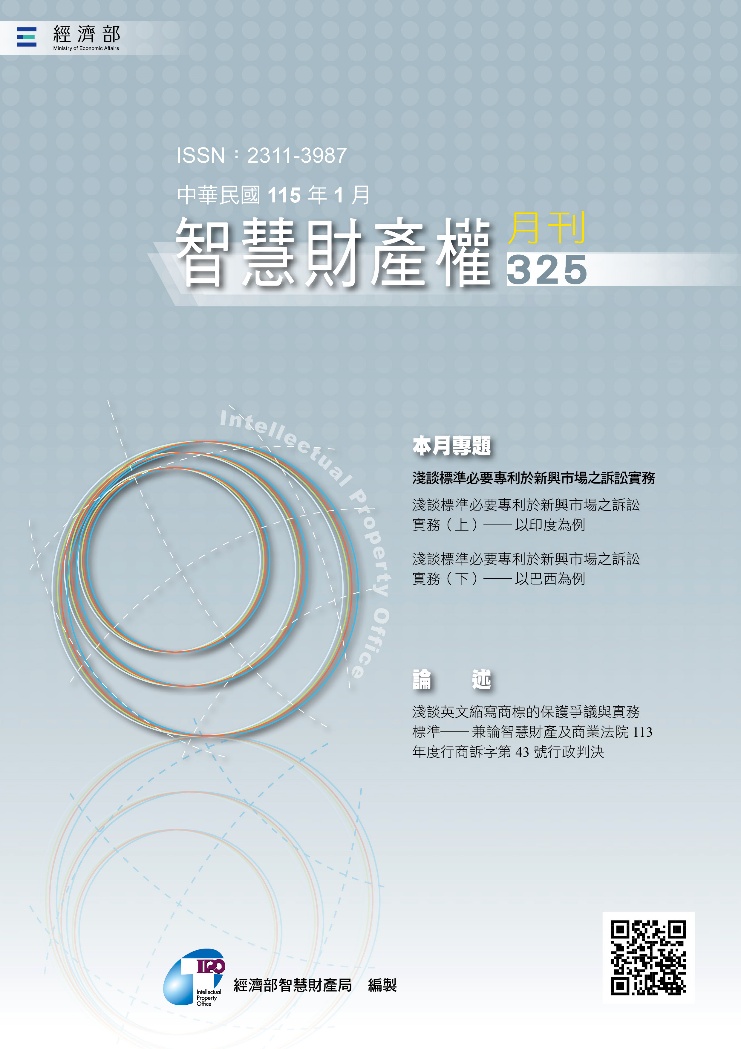 115年1月號第325期智慧財產權月刊出版新訊(國際及法律事務室)本月專題—淺談標準必要專利於新興市場之訴訟實務 標準必要專利(Standard Essential Patent, SEP)是為了實現某項特定技術標準而無可避免必須使用的專利。近年來新興市場數位產業快速發展,在印度及巴西相關SEP訴訟實務中,法院如何公正地處理這些SEP案件的授權及侵權爭議,非常值得深入研究探討。本月專題探討印度及巴西的專利訴訟制度及SEP司法實務,可提供各界參考。 詳細內容,請參... - 8